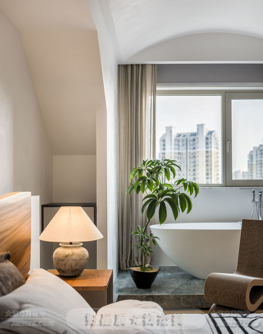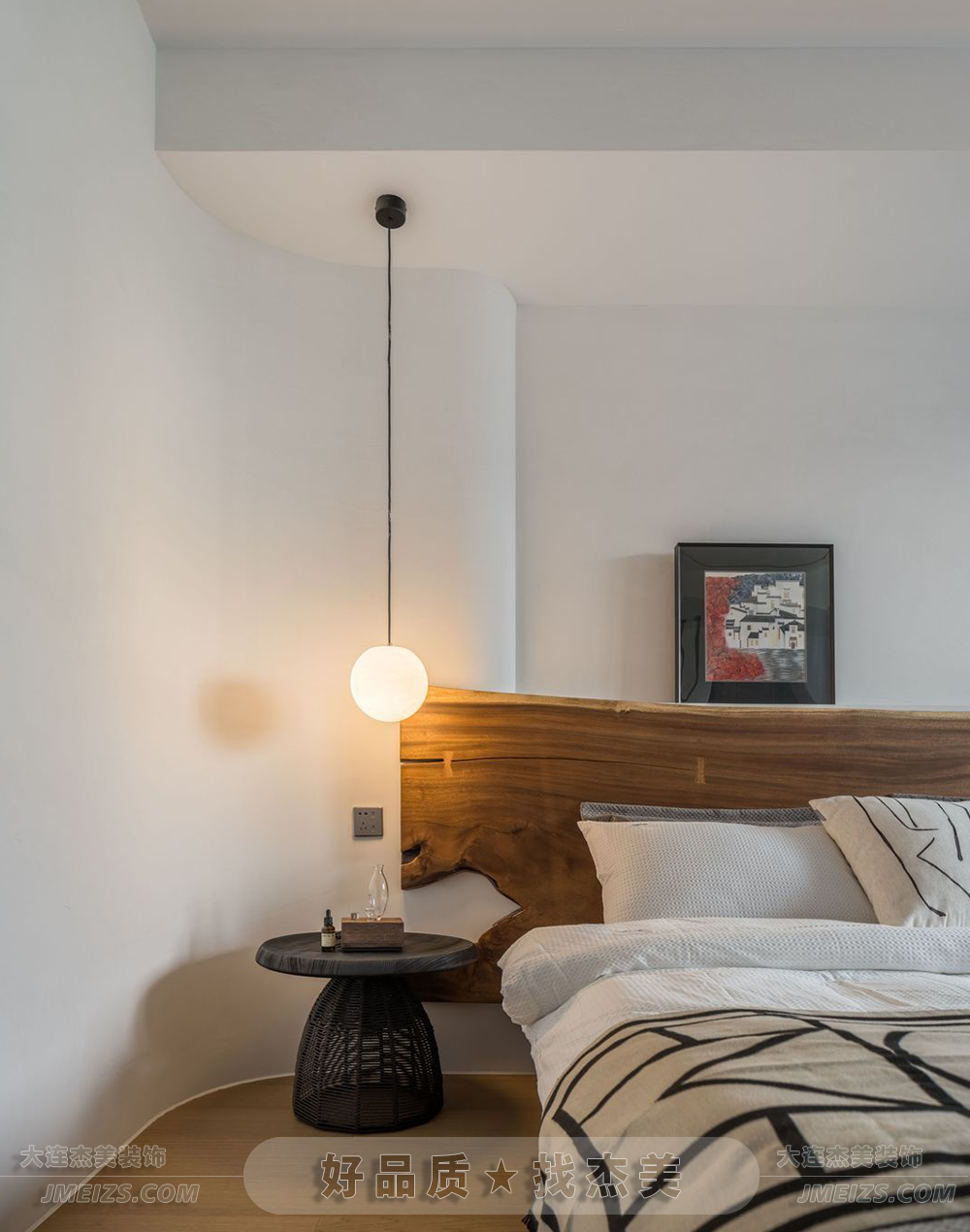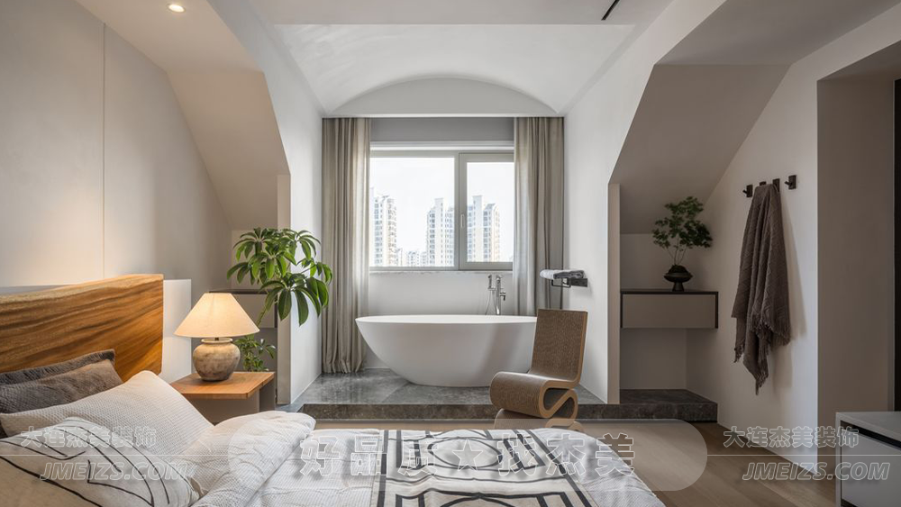主臥的設(shè)計注重了空間的私密性和多功能性。原生態(tài)的實木床頭和懸浮床架的設(shè)計都體現(xiàn)了對自然和簡約美學的追求。浴缸的設(shè)置則是一種生活方式的體現(xiàn),它不僅滿足了居住者的基本需求,還增加了空間的趣味性和功能性。