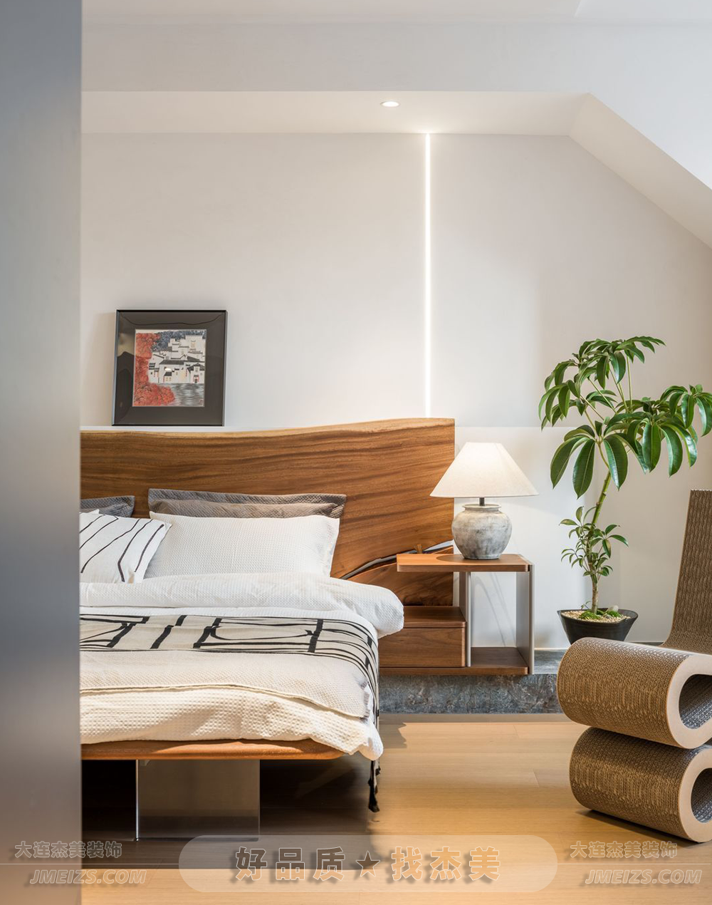 主臥設(shè)計給人一種寧靜自然的感覺。床頭采用了原生態(tài)的實木,懸浮的床架設(shè)計非常特別。此外,浴缸也被設(shè)計在主臥內(nèi),增加了空間的多功能性。